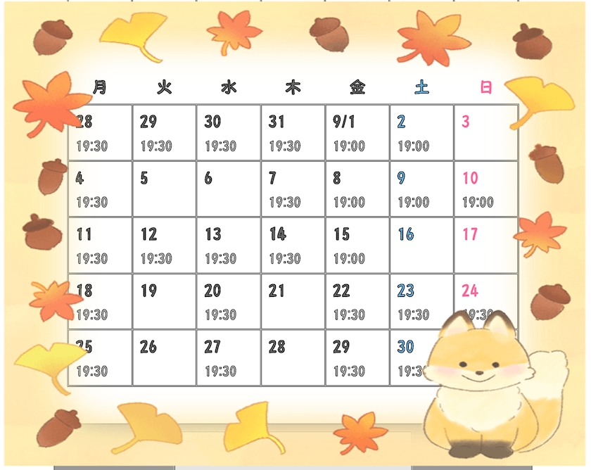 9月後期の出勤予定
