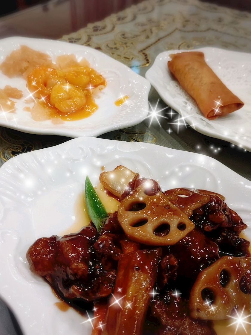 海老チリ、春巻き、黒酢豚