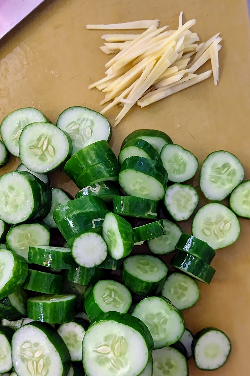 生姜は皮を剥いて千切りにする