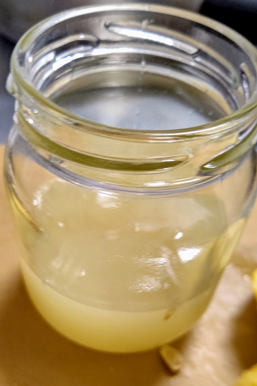④搾った果汁が100ccに満たなかったら、酢を入れて調整する