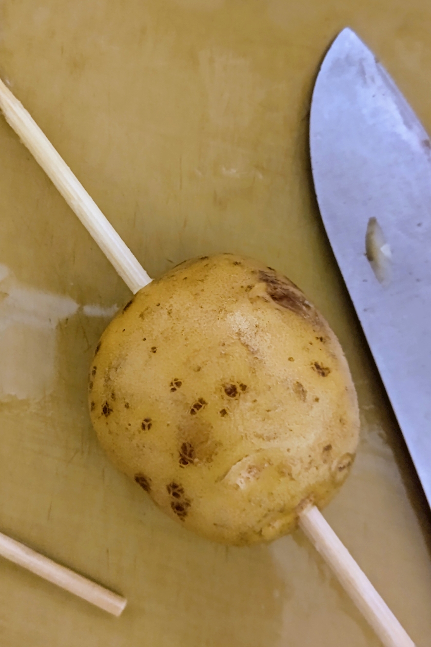 ②じゃが芋の真ん中に割り箸をグッと刺す
