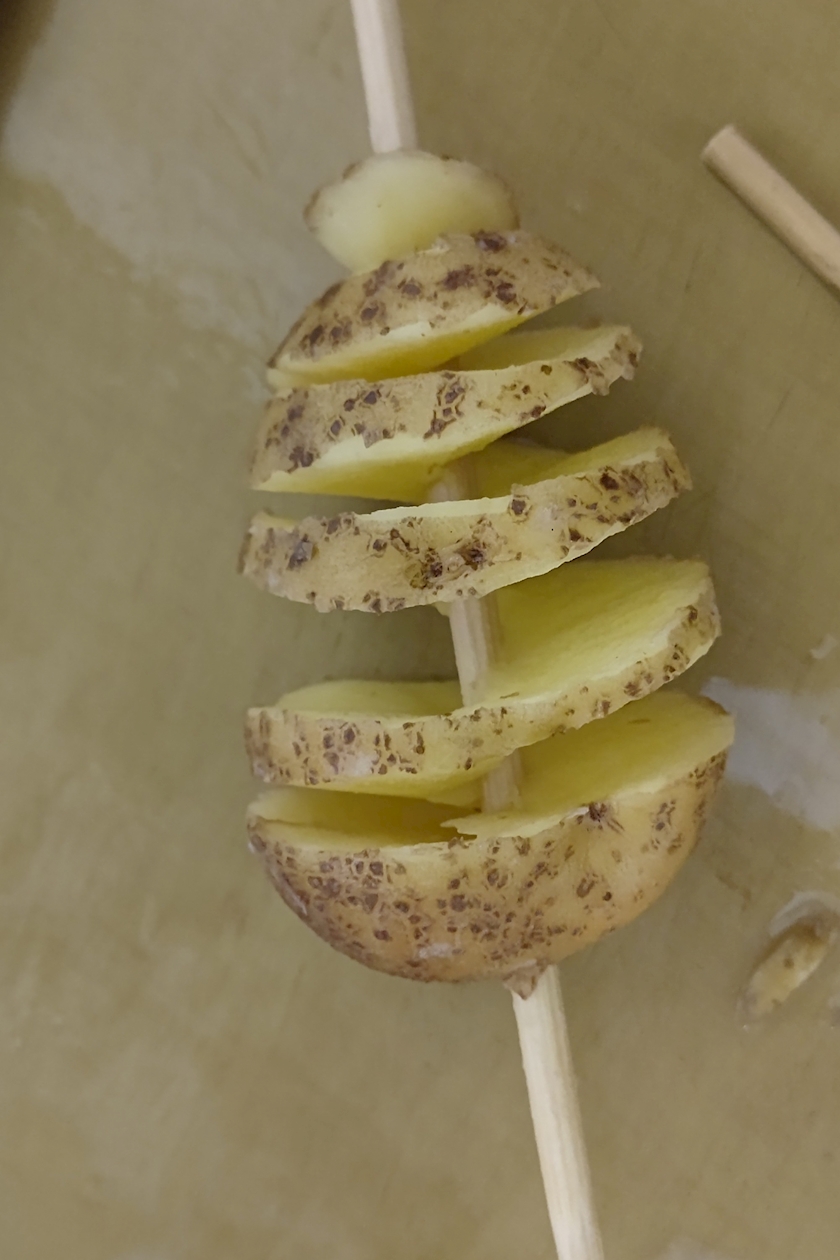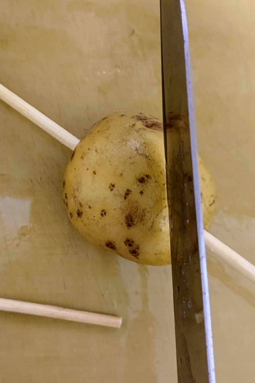 ③割り箸で刺したじゃが芋を置き、斜めに包丁で回しながら切り込みを入れる