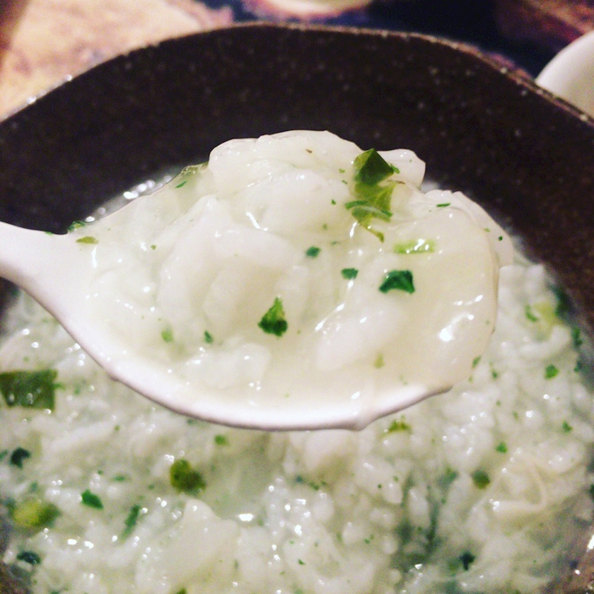 お粥は、ホタテの缶詰を汁ごと入れて