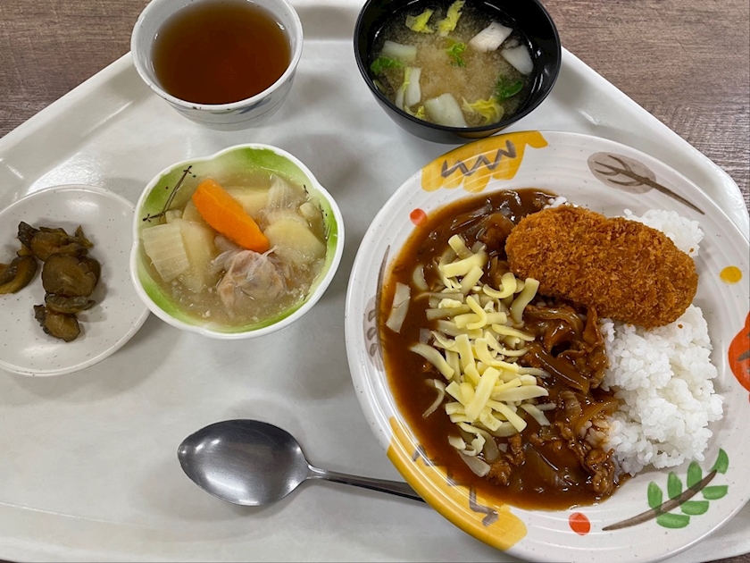 献立には「チーズハヤシライス」しか書いてなかったからチーズハヤシライスだけだと思ってたらまぁまぁデカいカボチャコロッケが乗っかってて腹マンになったぉ🤣あ、ちなみにうちの社食、献立が何であろぅがお味噌汁と小鉢は無条件でつぃてきまふ✨