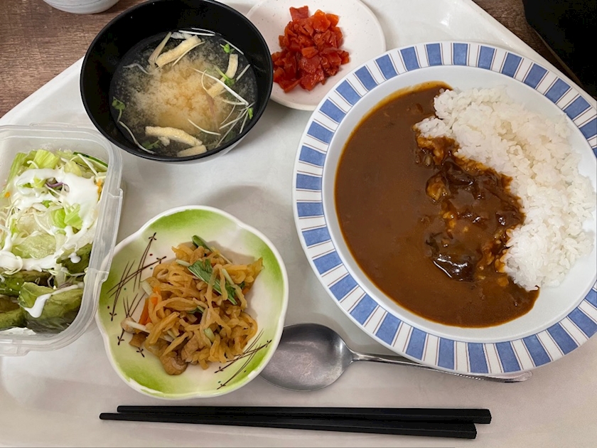持ってきたサラダがちょっとだから、軽食セット(おにぎり🍙、お味噌汁、小鉢)にしよぅかと思ったら何故か軽食セットが売り切れで(時間的に売り切れありえなぃので今日はたまたま無かったのかも🤔)仕方なしに選んだのがカレー🍛