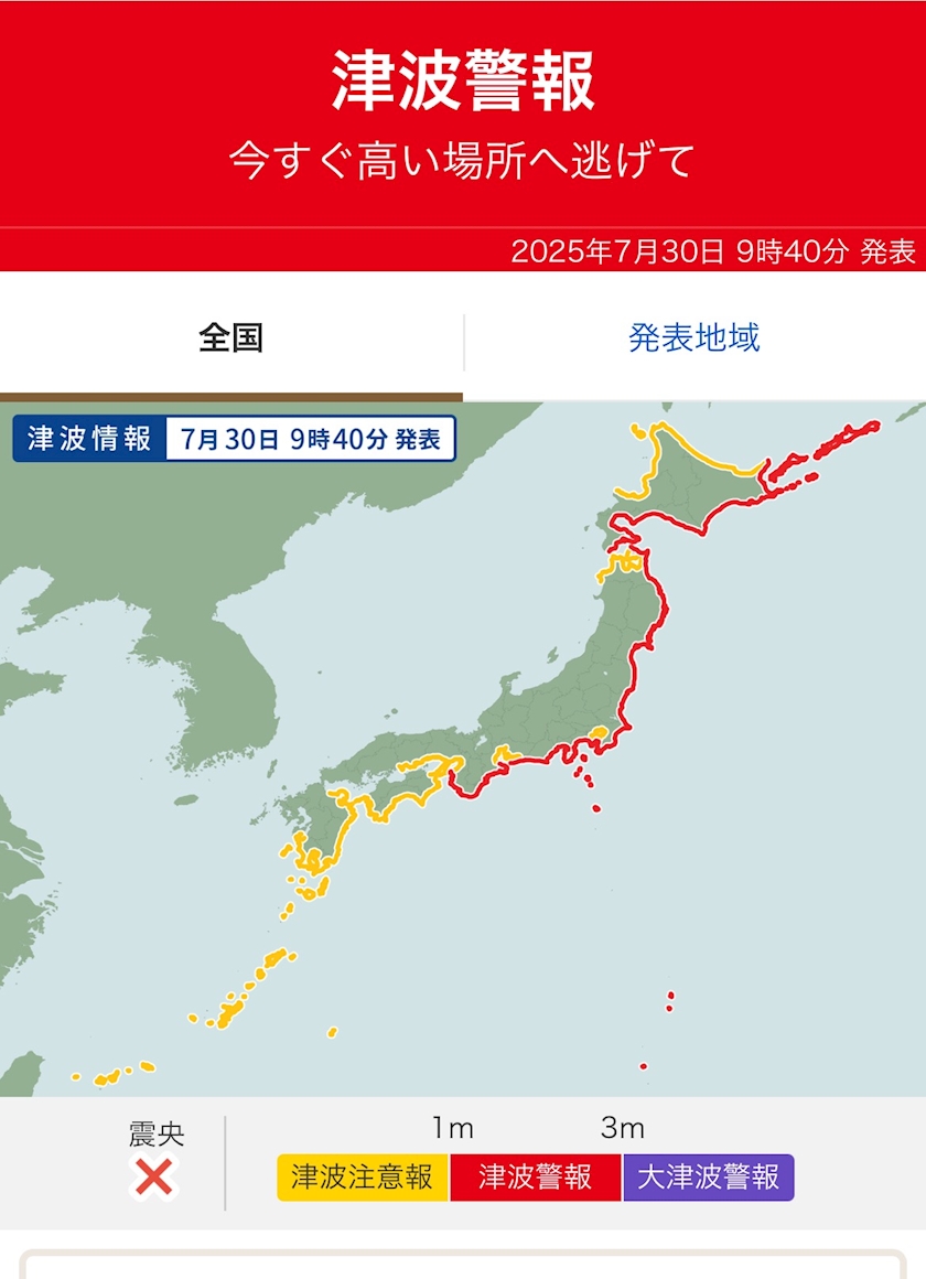 太平洋側の広い範囲で出てるので、沿岸部にお住まいの方々は甘く見ないですぐに海から離れて高い場所へ避難してくださいね。川も逆流しますから近づかないほうがいいです。