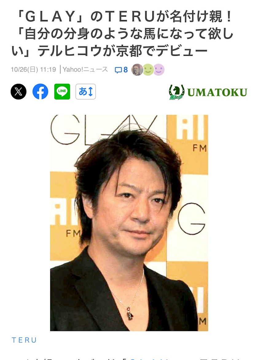 GLAYのTERUさんが名付けた馬が今日デビューするっていうのをXでたまたま知って、TERUさんフォローしてないけど競馬関連でおすすめに流れてきたのであろう、これも何かの縁✨✨て事で単勝で購入❣️
