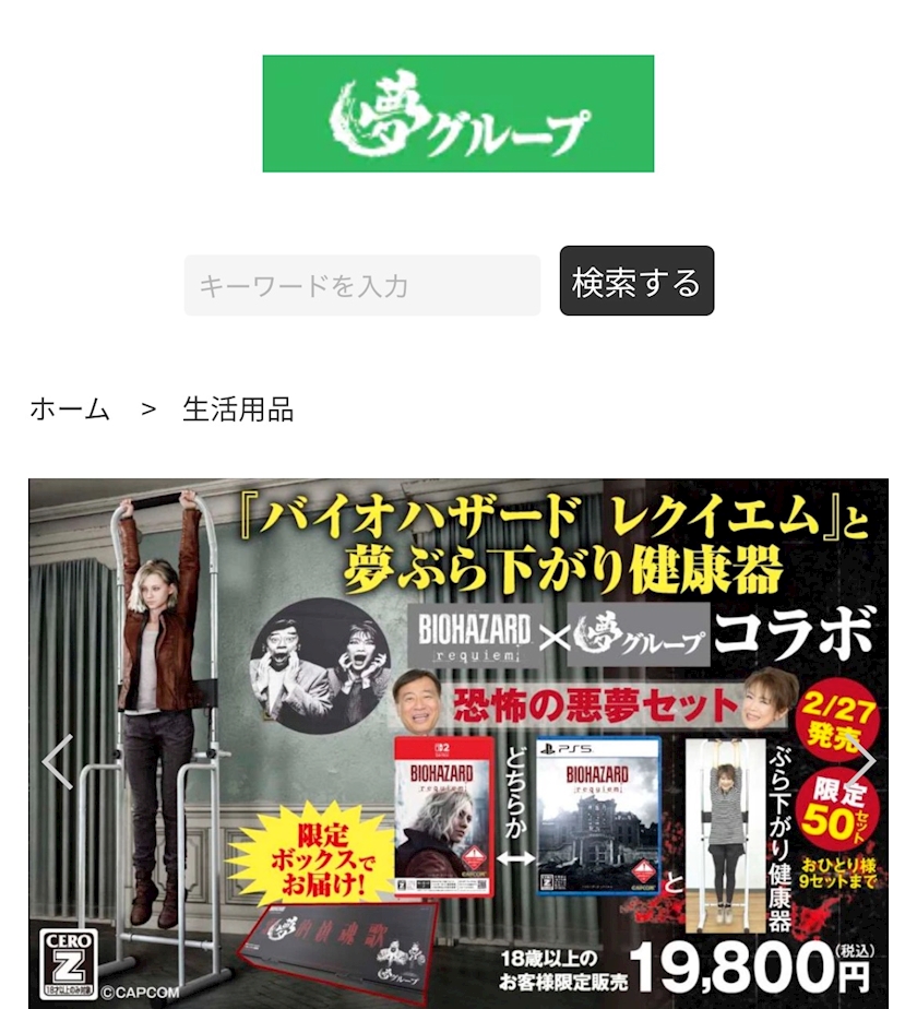 バイオハザードの新作を夢グループが通販で扱ってて噴いた🤣ぶら下がり健康器もついてくるそうな。