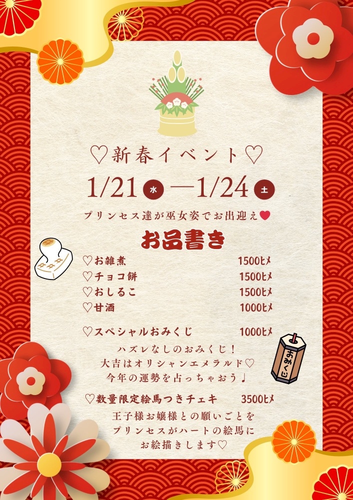 さてさて今月のイベントは…⛩🌸今回も特別メニューあります( ᵒ̴̶̷̤◦ᵒ̴̶̷̤ )来週1/21~1/24あそびにきてね♩ - るる໒꒱⟡.·金曜日のプリンセス - 金曜日のプリンセス・キンヨウビノプリンセス - 歌舞伎町のコンカフェ