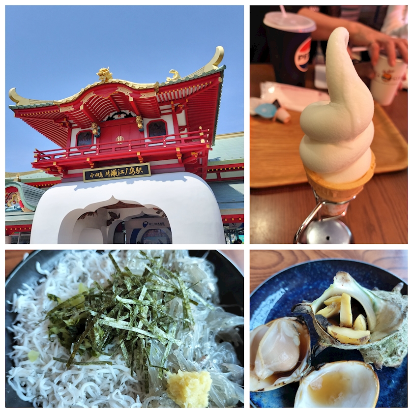 駅前も余り変わらず、カフェでお茶してからの江ノ島にある「きむらや」さんで生シラス丼とサザエ壺焼きハマグリ焼を食べてからの海水浴。