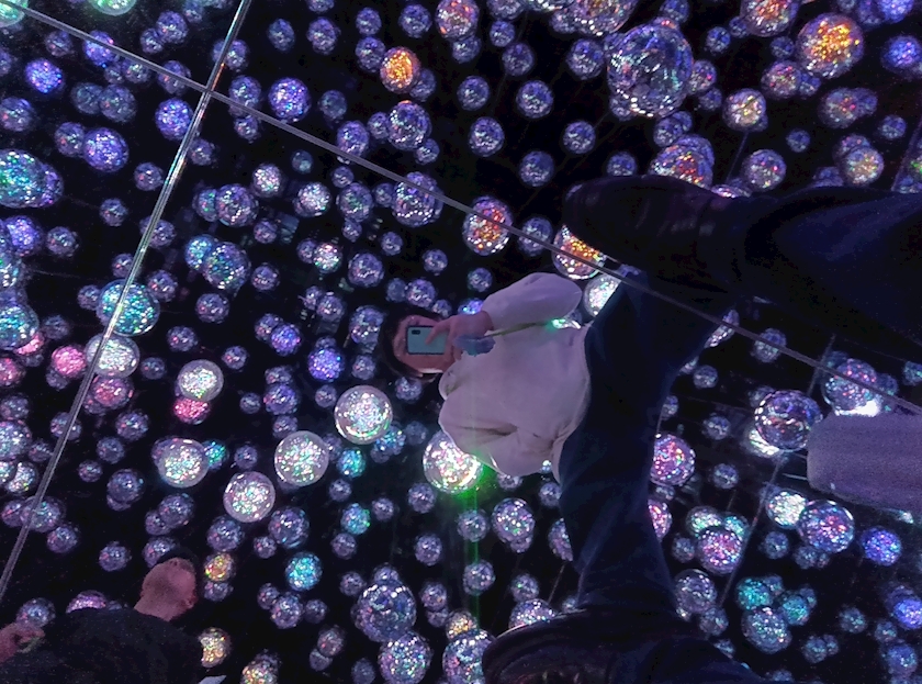 床壁が鏡張りで球体のライトが数多吊るされている作品