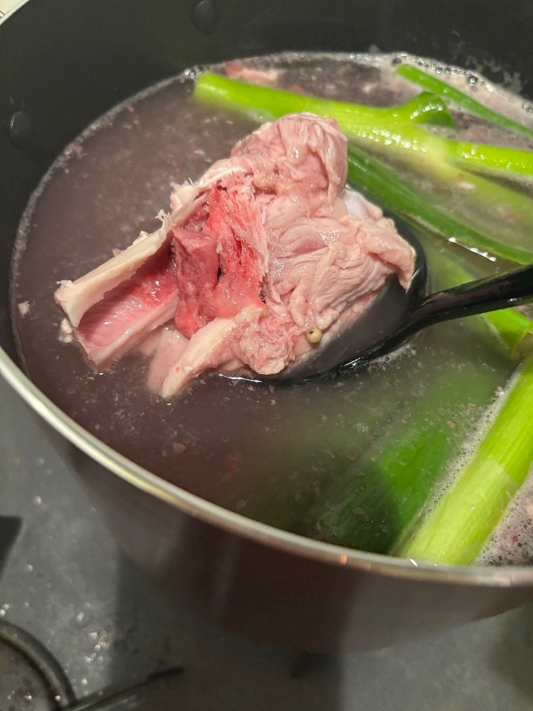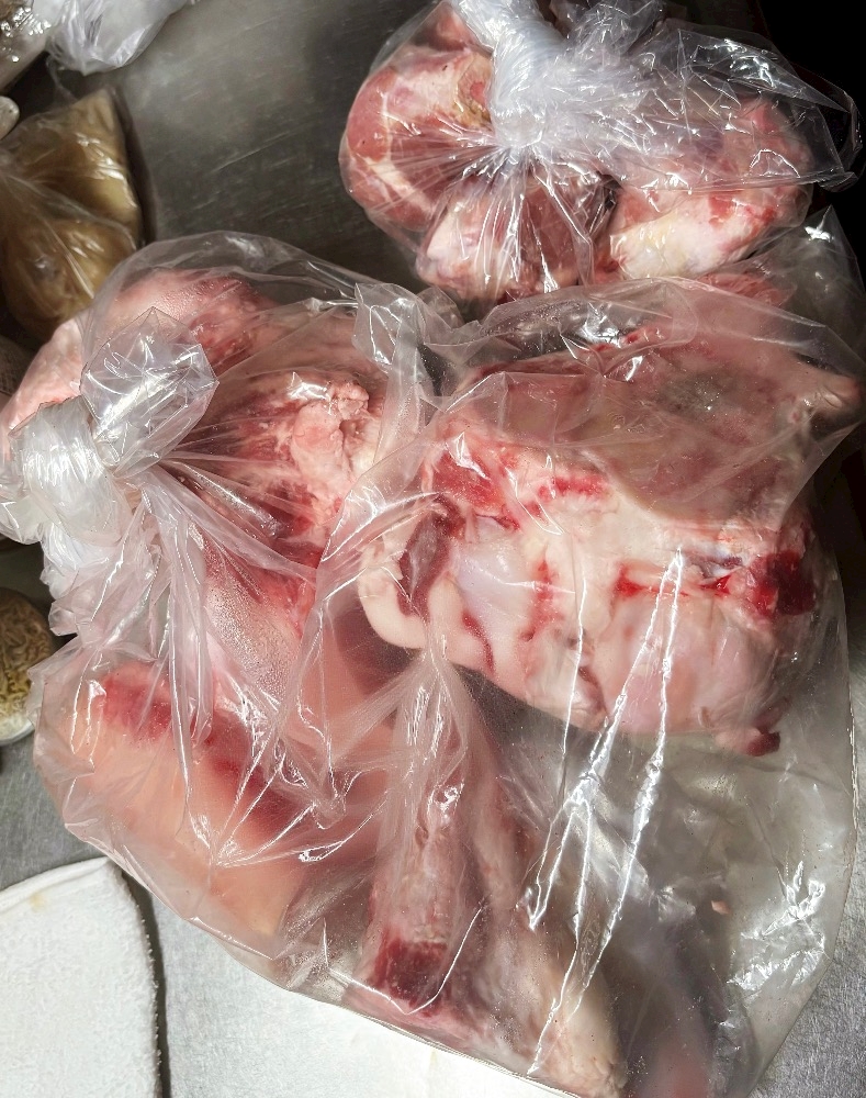 骨をトンカチで割り骨髄を出して12時間煮込みました