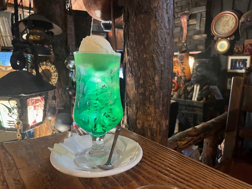 鮮やかな緑のメロンソーダにアイスクリームが乗った王道なものをまずは注文!