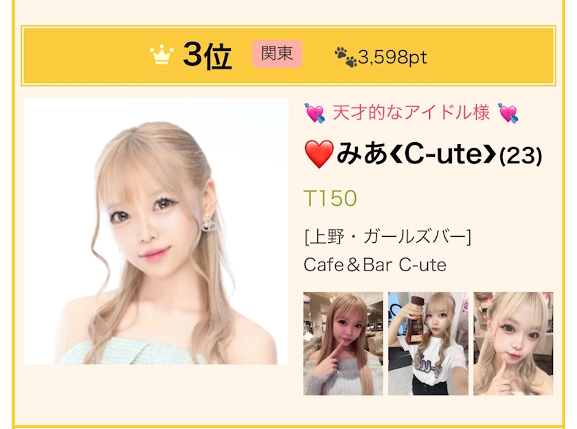 全国 3️⃣ 位だってよ‼️🤣🤣🤣🤣🤣 - ❤️みあ❮C-ute❯ - Cafe&Bar C-ute・キュート - 上野のガールズバー