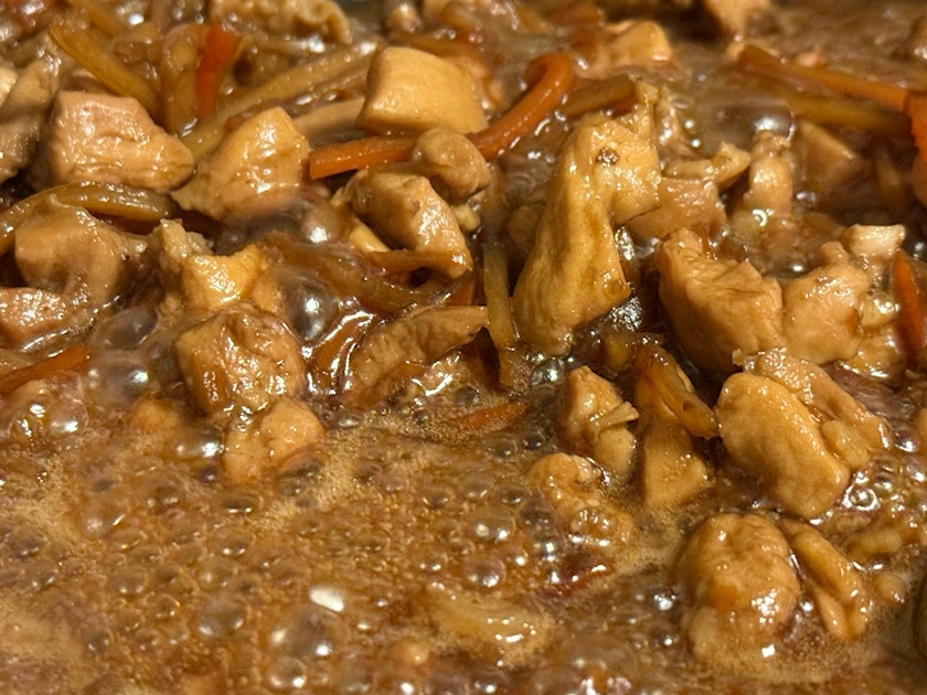 お醤油、お酒、お砂糖で煮た鶏肉とごぼうを混ぜた五目ごはん、的な、、❓