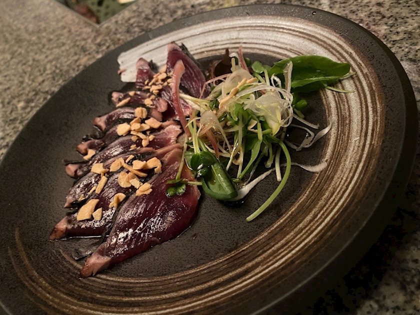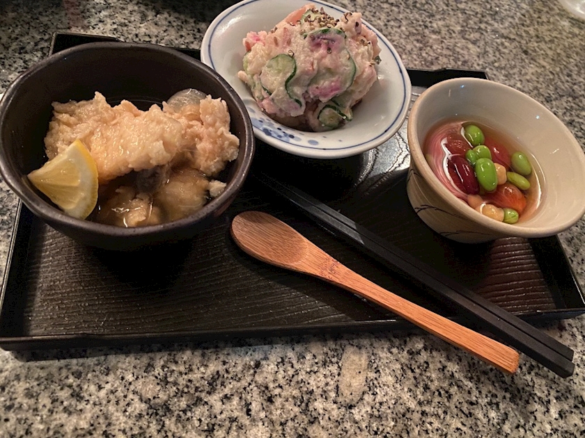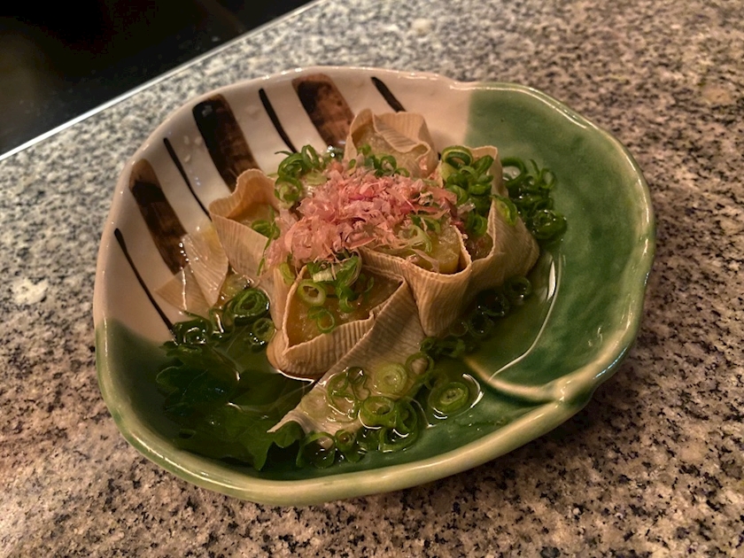 茄子の湯葉巻き、鰹のカルパッチョ、