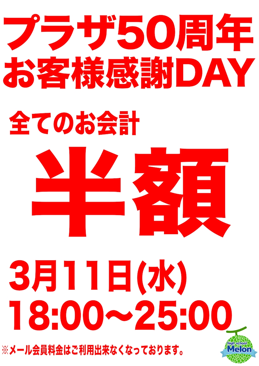 3/11(水)プラザ50周年お客様感謝DAY【オール半額】 - メロンStaff - High School Melon・ハイスクールメロン - 上野のキャバクラ