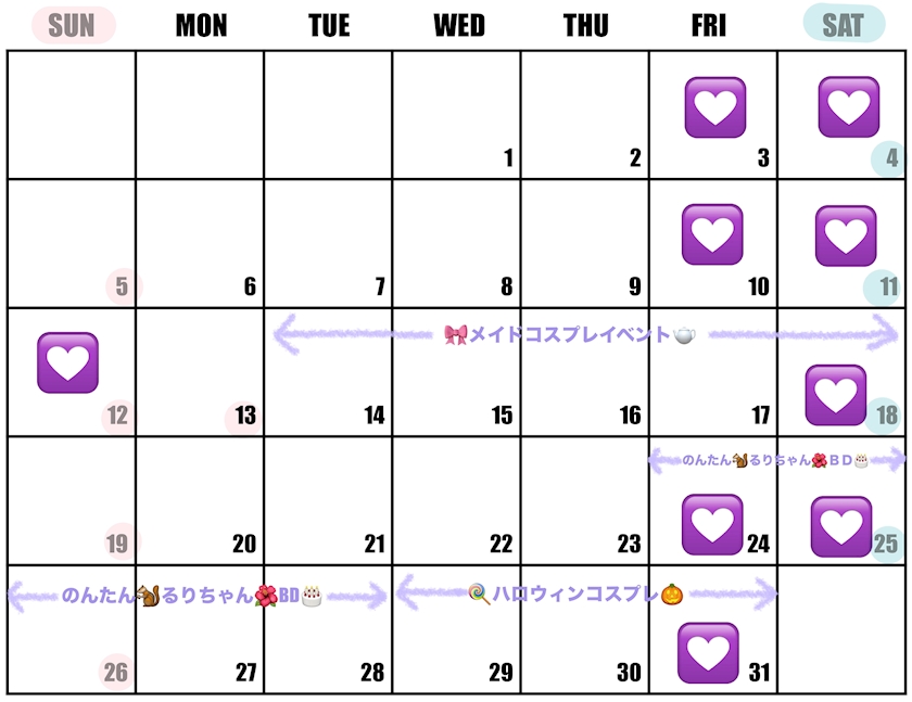 10月の出勤予定(^ー^)☝🏻 今月もイベントたくさんです!!🎶