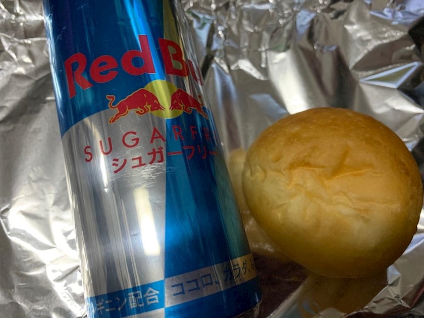 昼食はまるパンとレッドブルを👼
