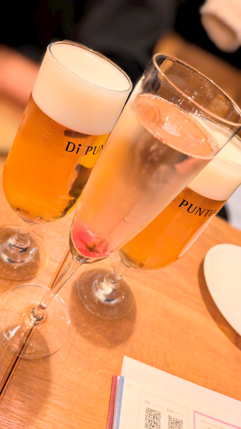 スパークリングワインの下には桜の花びらが。