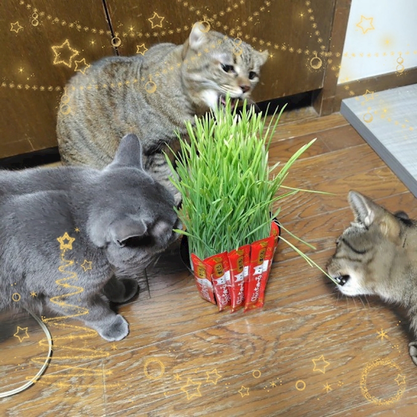 みんなでムシャムシャ、猫草パーティー