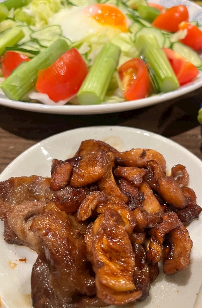 唐揚げの際に取り除いた鶏皮を味をつけて焼いてみた😄