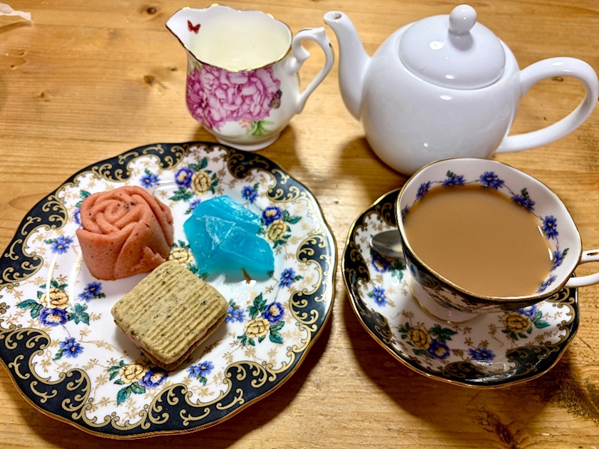 お茶菓子が薔薇のパウンドケーキとイチゴのクッキーサンドりんごの琥珀糖です😋💕
