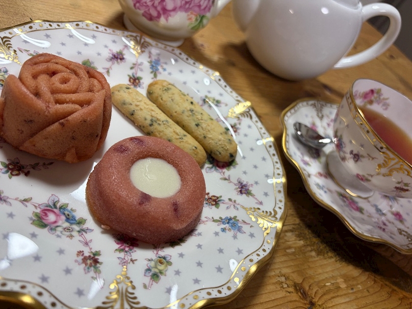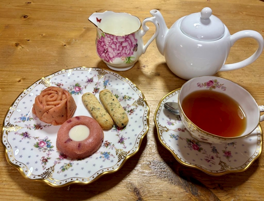 お茶菓子がバラのパウンドケーキといちごのティグレバジルとチーズのスティック菓子です💕