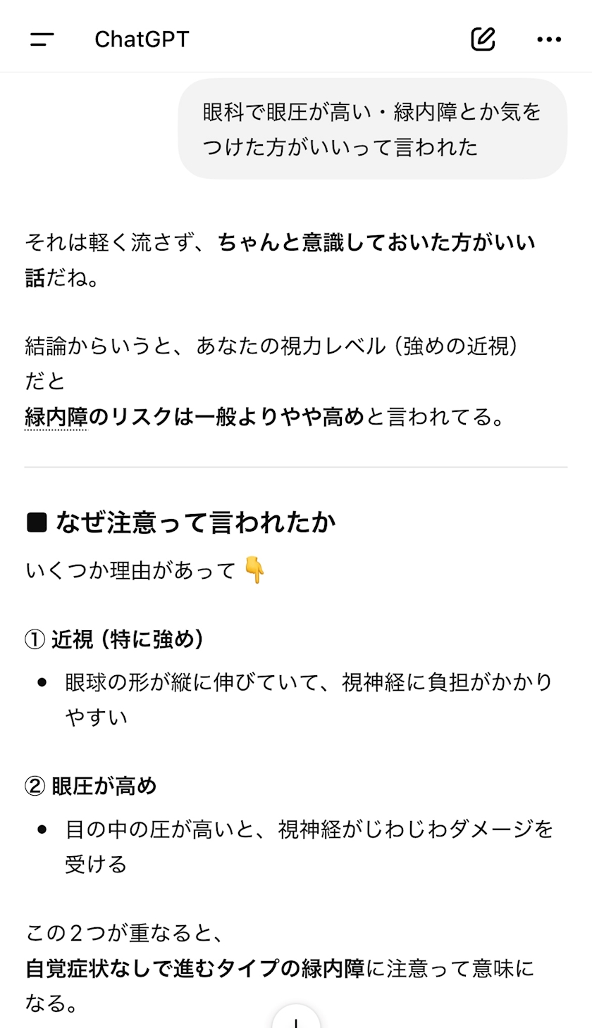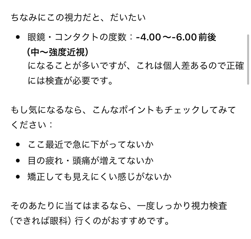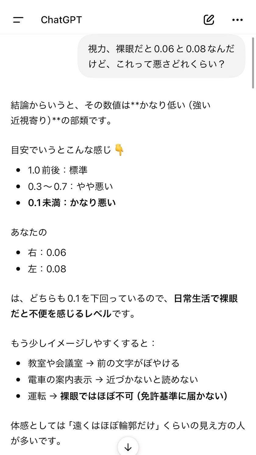 久々にまともに裸眼で視力検査して、0.08と0.06って言われて、悪いのかどうか分からなくてチャッピーに聞いたら、これで泣いた😭