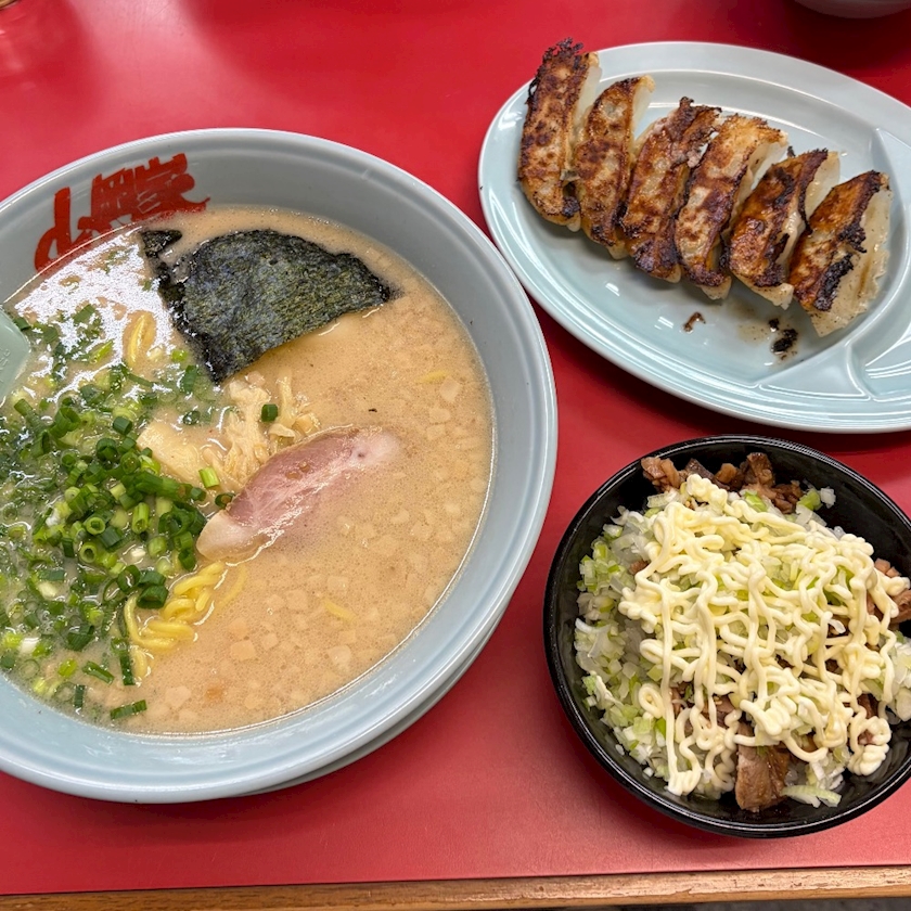 プレ塩中盛の硬濃多、ネギマヨチャーシュー丼、餃子