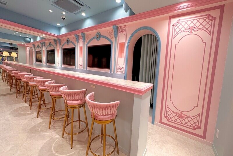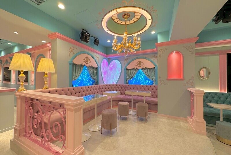 店内はテーマパークのお城を思わせるデザイン。ピンク、ブルー、パープルを基調としたパステルカラーの可愛い空間に、シャンデリアなどゴールドのアクセントが全体にラグジュアリー感をプラスしています♪