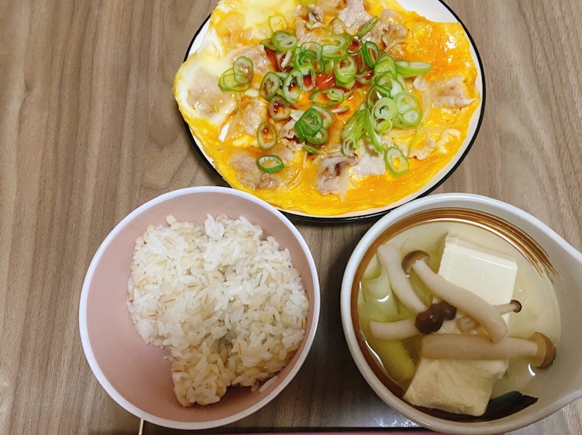 今日はもち麦ご飯、湯豆腐、豚肉炒めたやつを卵でとじたやつ✨✨