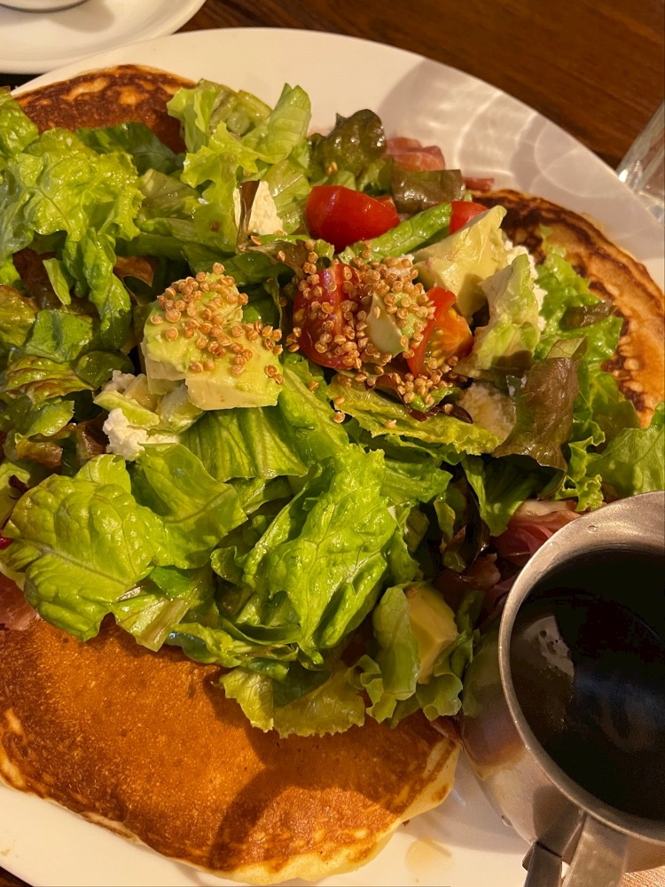 パンケーキ🥞にサラダがのってるやつ〜