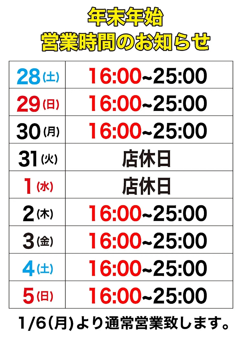 月~金18:00~25:00 土日祝16:00~25:00 |